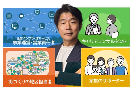 長年、通信インフラ事業・ITサービスに従事してきたビジネスマンとして実績を積んで参りました。人事・採用育成・労務・制度運用~サービス開発~マス・法人営業など多岐に渡る経験を積ませていただきました。また、国家資格 キャリアコンサルタント等を取得し、厚労省受託リスキリング相談コーナーで今後の就労について考える社会人の皆さんに対してコンサルティングを行うとともに、大学非常勤講師として学生の皆さんに対して今後のキャリア形成についての講義を担当しながら、自分自身もキャリアに関する知識の習得やカウンセリング技術等の向上に取り組んでいます。このほかに、地区の自治会長、評議員などの立場から見た地域課題、介護認定の母親を持つ息子・子育てとパート勤めをこなす妻・多感な中高生の子供たちの生活目線から改善点や未来を展望したあるべき姿などについて考える機会をいただいております。
